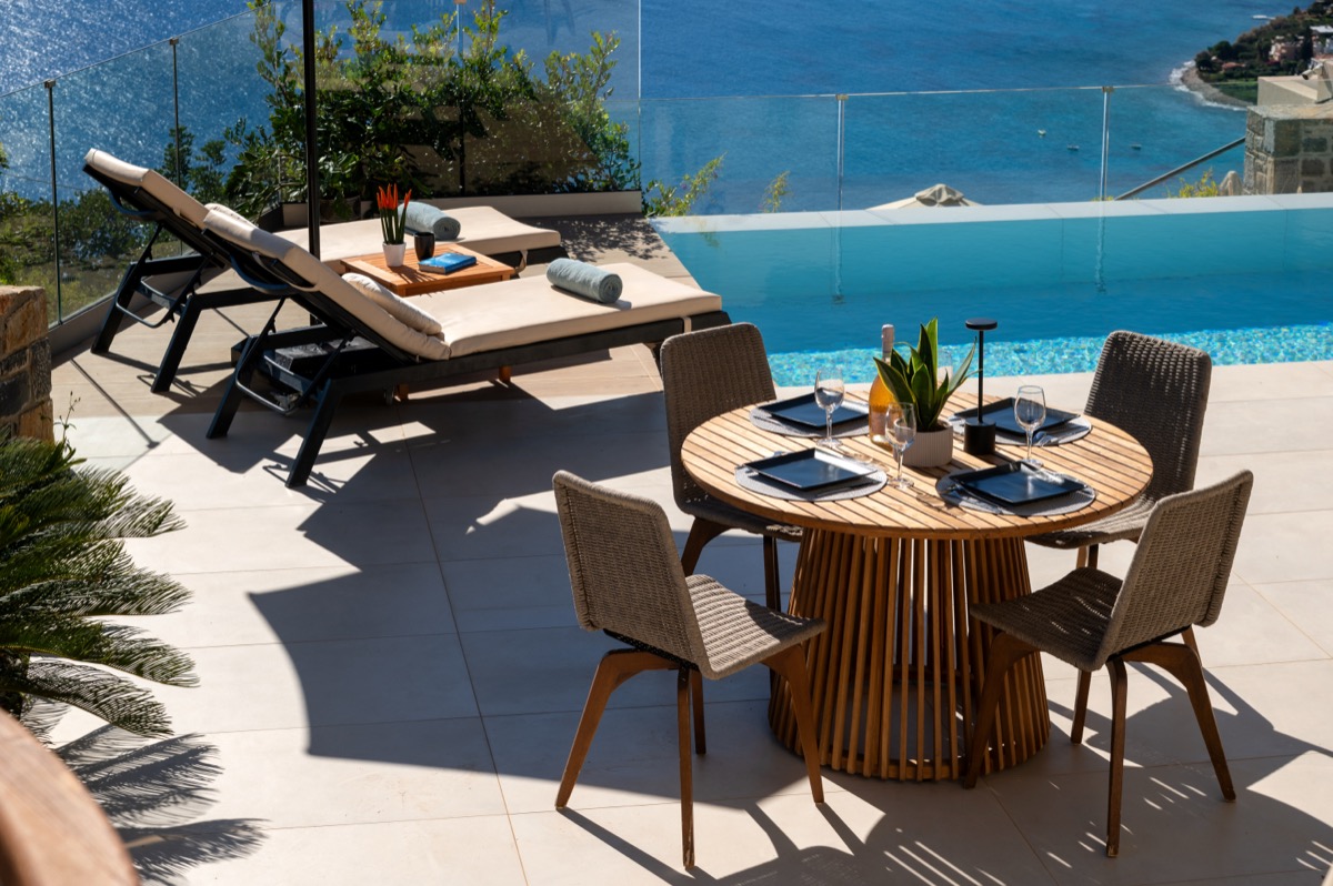 The outdoor area is the highlight of Villa Dione, curated for ultimate relaxation against the backdrop of the Aegean blue: