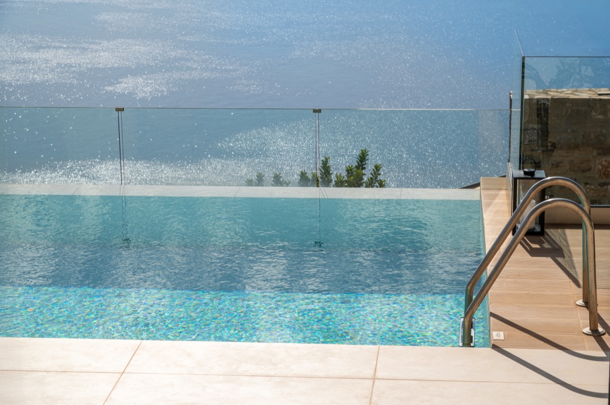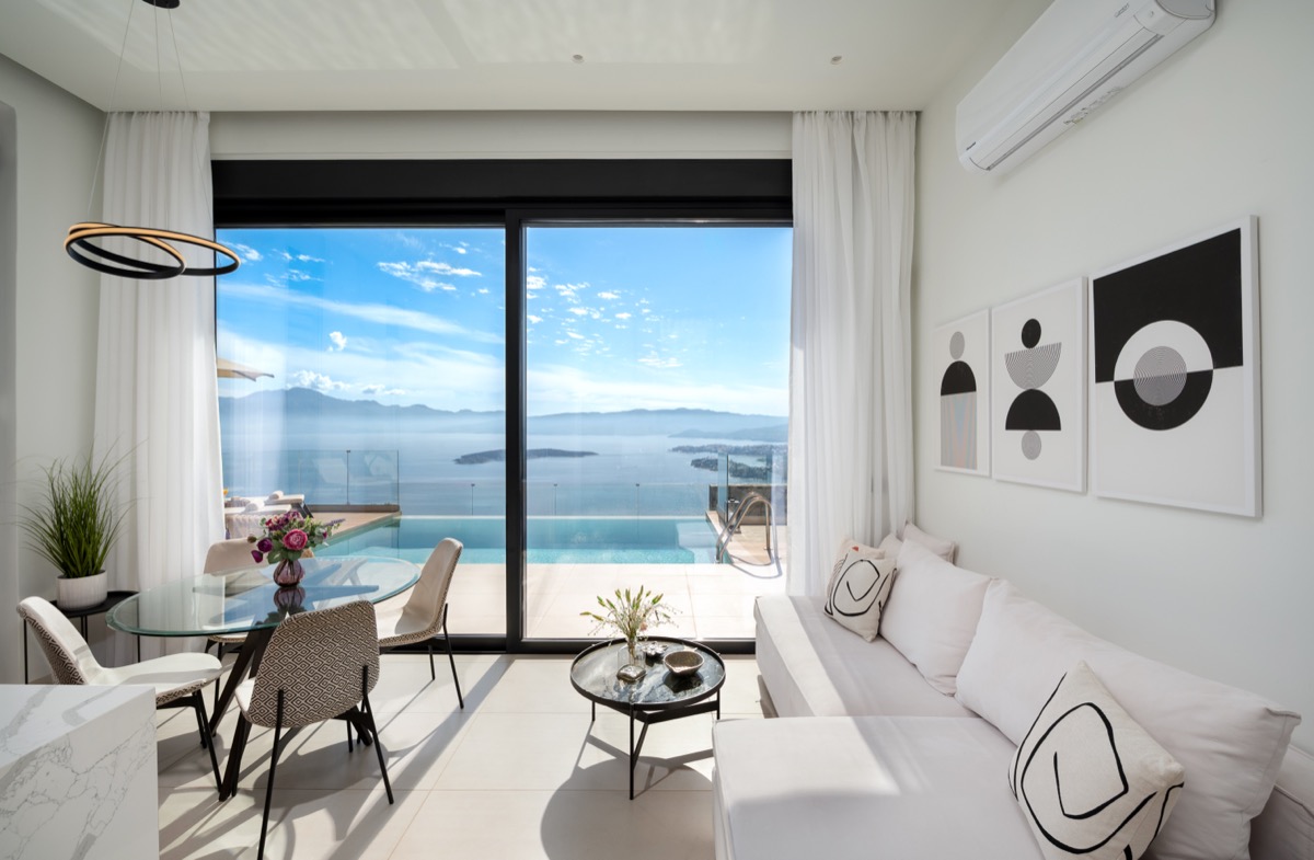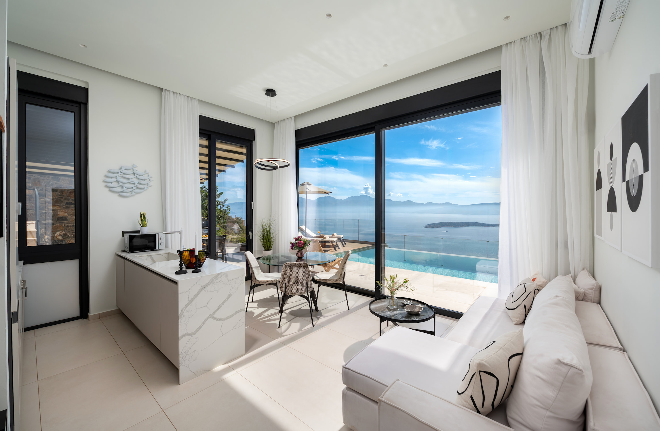 - Direct Access: Sliding doors connect the living area directly to the pool, offering unobstructed sea views.