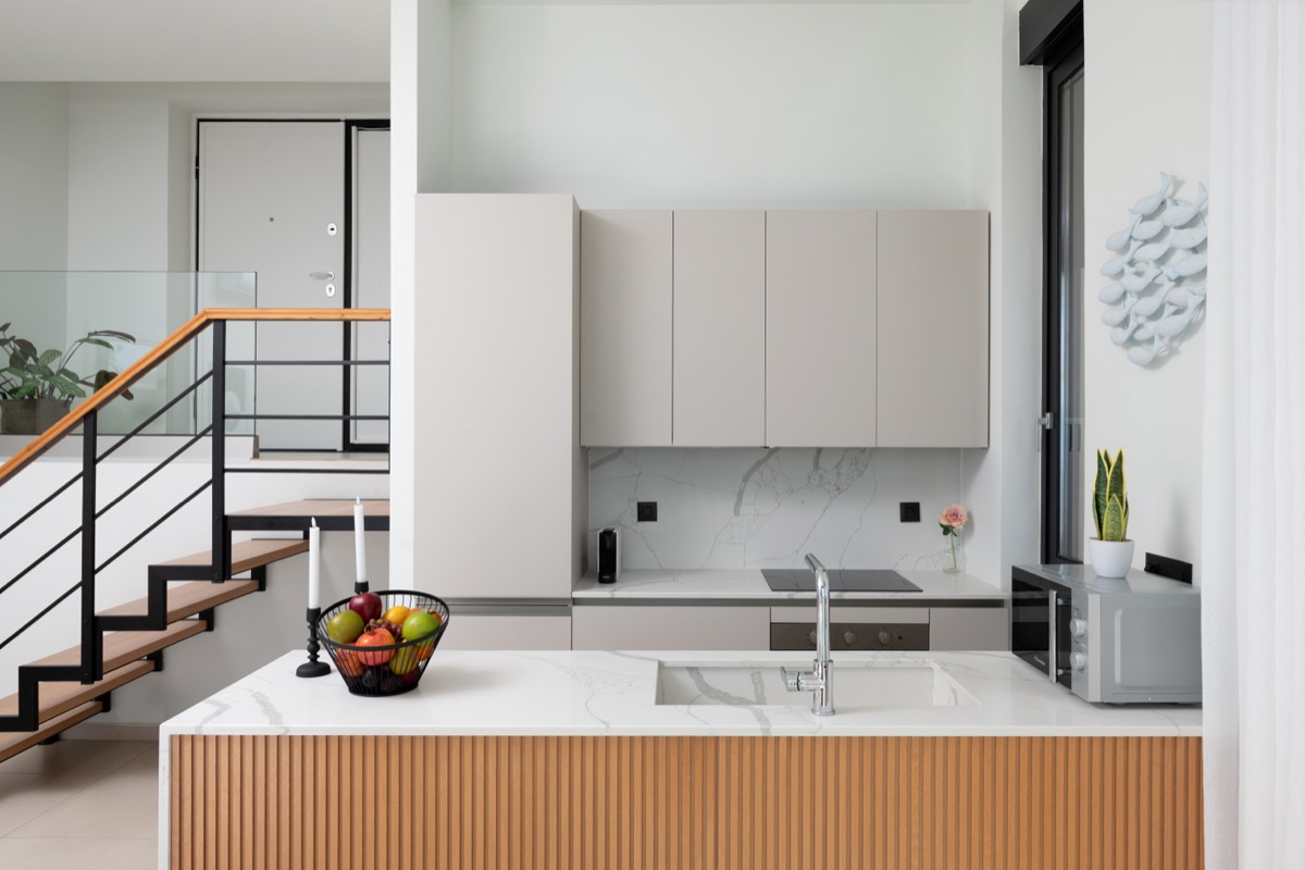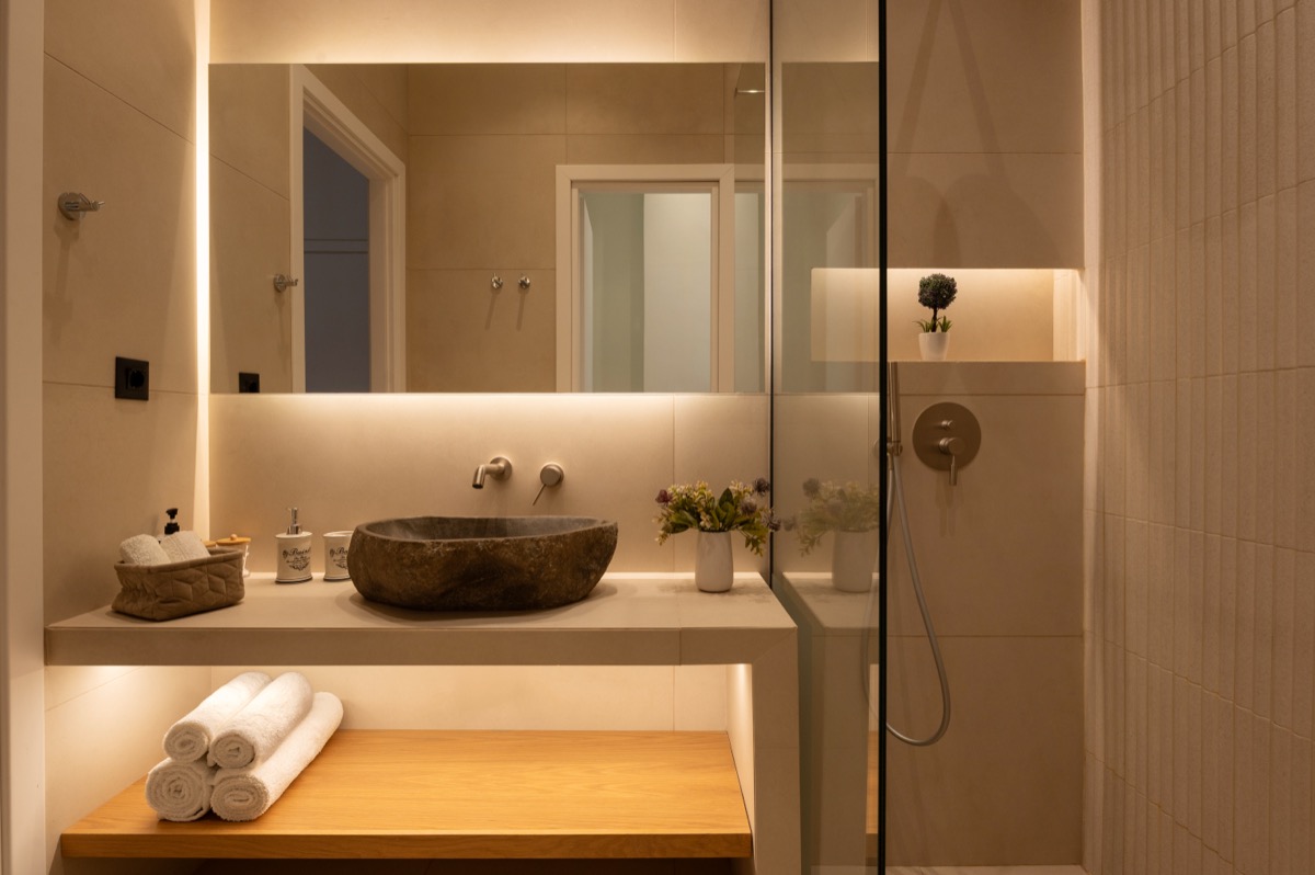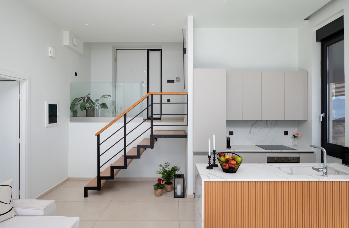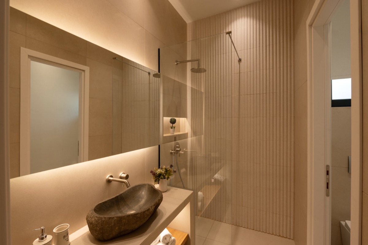 Spanning 70 sq.m. across two levels, the villa comfortably accommodates up to 4 guests. Its design features minimal lines, combining white tones, stone walls, and wooden accents that exude warmth and modern aesthetics.
